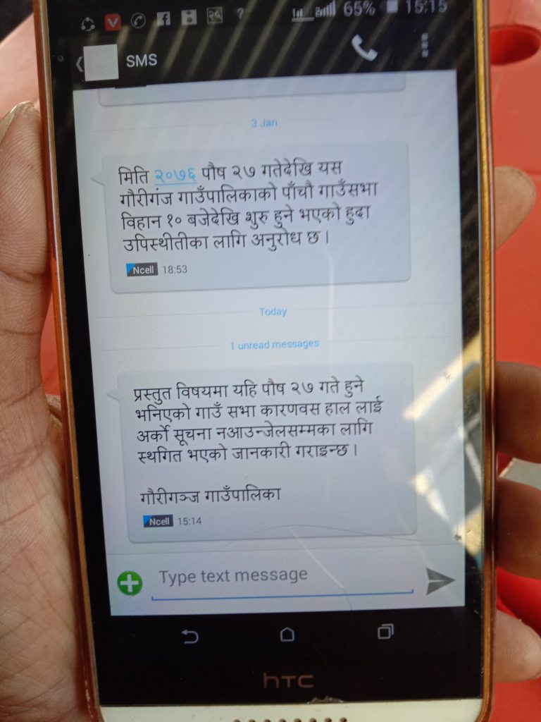 अन्तिम समयमा आएर गाउसभा स्थगित भएपछी शुक्रबार दिउसो गाउँपालिकाका सबै जन प्रतिनिधिहरुलाइ मोबाइल एसएमएस मार्फल गाउँसभा स्थगित भएको सुचना पठाइएको थियो । यद्यपी सुचनामा गाउँसभा स्थगित हुनुको कारण भने खुलाइएको छैन ।