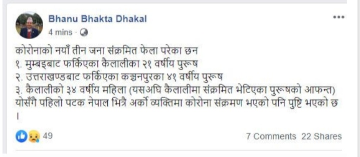 त्यस्तै, उत्तराखण्डबाट फर्किएका कञ्चनपुरका ४१ वर्षीय पुरूषलाई पनि कोरोना भाइरस पुष्टि भएको छ।