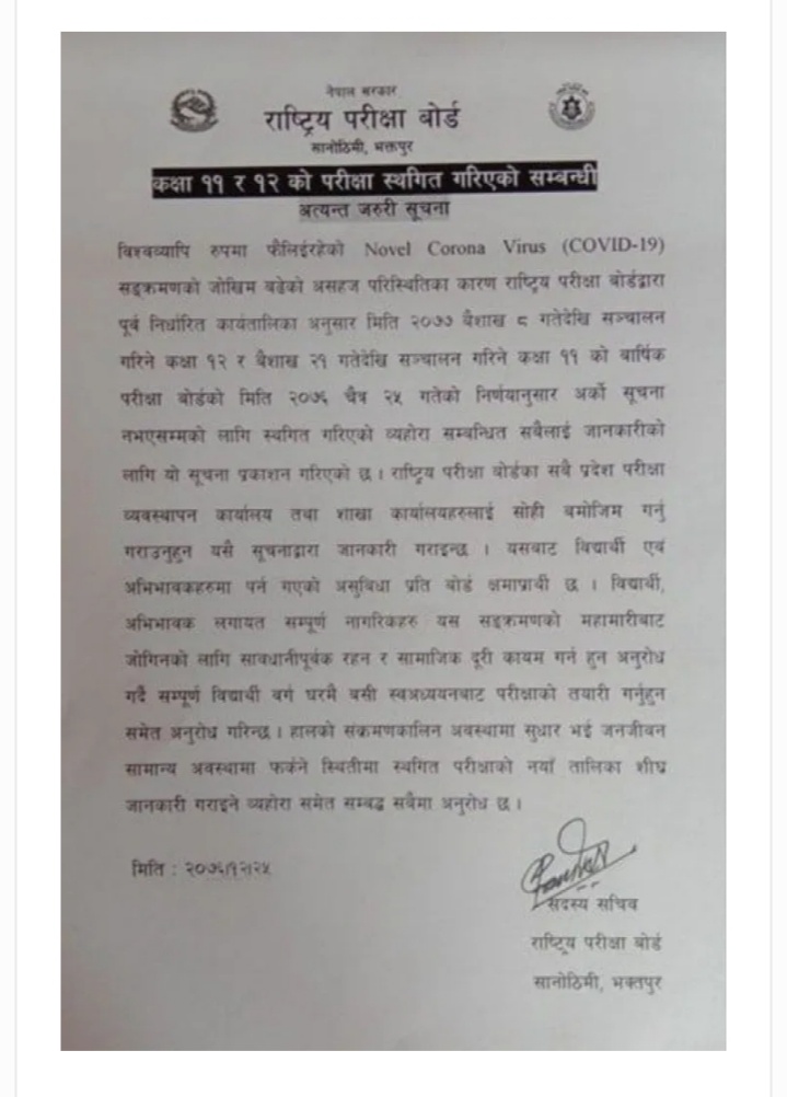 कोरोना भाइरस संक्रमणको जोखिमका कारण राष्ट्रिय परीक्षा बोर्डले कक्षा ११ र १२ को परीक्षा स्थगित गरेको छ । वैशाख २१ गतेदेखि हुने भनिएको कक्षा ११ को परीक्षा र वैशाख ८ गतेदेखि हुने भनिएको कक्षा १२ को परीक्षा मंगलबार दिउँसो बसेको बोर्डको बैठकले अर्को सूचना जारी नहुञ्जेलका लागि परीक्षा स्थगित गर्ने निर्णय गरेको हो।