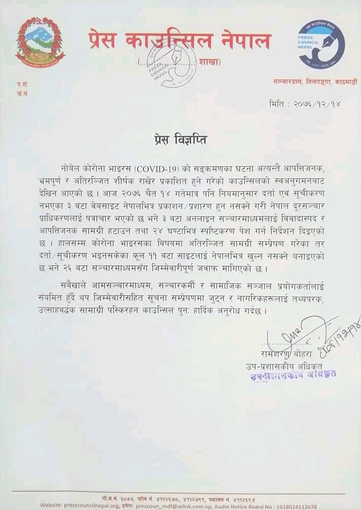 यसै गरि कोरोना भाइरसबारे भ्रम फैलाउने ३ वटा वेवसाइट बन्द गराइएको प्रेस काउन्सिलले जनाएको छ ।