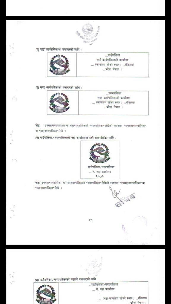 स्थानीय तहको सेवा सञ्चालन तथा ब्यवस्थापन सँबन्धी आदेश २०७४ को अनुसुची ६ मा स्थानीय तहले कस्तो ढाँचाको छाप स्टाम्प प्रयोग गर्ने भन्ने बारे स्पष्ट सँग उल्लेख गरिएको छ । जस अनुसार गाउँपालिकाको हकमा नेपाल सरकारको लोगो मुनी गाउँपालिकाको नाम र त्यस मुनी गाउँ कार्यपालिकाको कार्यालय र तल ठेगाना लेख्नु पर्ने प्राबधान छ । तर गौरिगञ्ज गाउँपालिका र कमल गाउँपालिकाको स्टाम्पमा भने अनुसुची अनुसारको ब्यहोरा नै उल्लेख छैन । यि दुबै गाउँपालिकाले आफ्नो छापमा गाउँकार्यपालिकाको कार्यालय हुनु पर्ने ठाउमा गाउँपालिकाको कार्यालय मात्र लेखेका छन् ।
