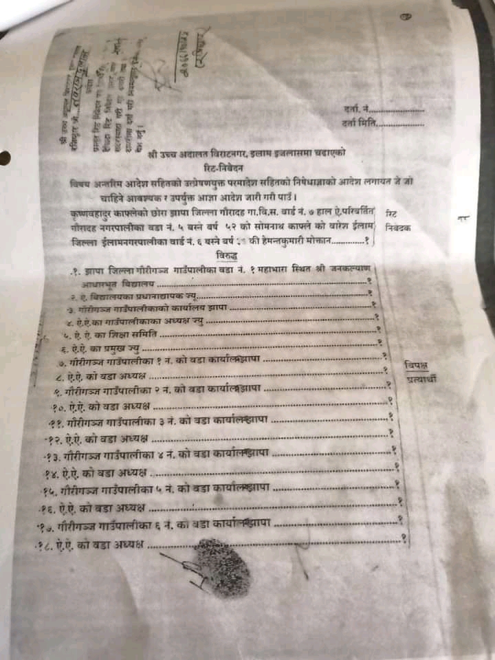 फागुन ७ गौरीगञ्ज । गौरीगञ्ज गाउँपालिका भित्रका सामुदायिक विद्यालयहरु गठन गरिएकोछ बिद्यालय ब्यवस्थापन समिति शिक्षा ऐन २०२८ बिपरित रहेको भनि उच्च अदालत, बिराटनगर, ईलाम ईजलास मा रिट दायर भएको छ । गौरीगञ्ज वडा नँ १ स्थित जनकल्याण आधारभुत विद्यालय का शिक्षक सोम नाथ काफ्ले र ईलामका हेमन्त कुमारी मोक्तान ले गत जेठमा गौरीगञ्ज गाउँपालिका शिक्षा समिति ले गठन गरेको विद्यालय व्यवस्थापन समिति शिक्षा ऐन विपरित भएकोले सो कार्य रोक्न अन्तरिम आदेश सहितको उत्पेषणयुक्त परमादेश सहितको निषेधाज्ञा लगायतको आदेश का लागि रिट दायर गरेको हो ।