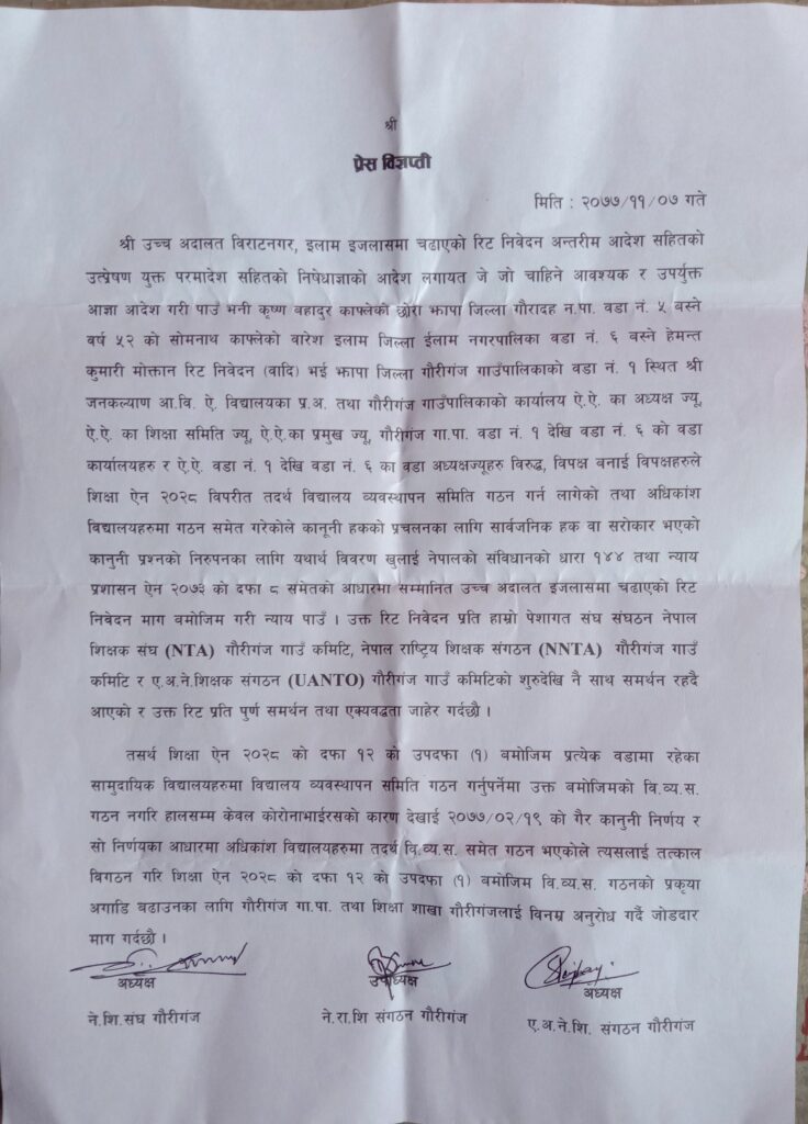 नेपाल शिक्षक सँघ गौरीगञ्ज गाउँ कमिटी अध्यक्ष गोपाल प्रसाद ताजपुरिया, नेपाल राष्ट्रिय शिक्षक संगठन गौरीगञ्ज गाउँ कमिटी उपाध्यक्ष बरुण कुमार राजबँशी र एकिकृत अखिल नेपाल राष्ट्रिय शिक्षक सँगठन गौरीगञ्ज गाउँ कमिटी अध्यक्ष प्रकाश चन्द्र राजवँशी द्वारा सँयुक्त रुपमा जारी गरिएको विज्ञप्तिमा शिक्षा ऐन २०२८ बिपरित तदर्थ बिद्यालय ब्यवस्थापन समिति गठन गर्न लागेको तथा अधिकाँश विद्यालय मा गठन समेत गरेकोले कानुनी हकको प्रचलनका लागि सार्वजनिक हक वा सरोकार भएको कानुनी प्रश्न को निरुपण का लागि यथार्थ बिबरण खुलाइ नेपाल को सँबिधान को धारा १४४ तथा न्याय प्रशासन ऐन २०७३ को दफा ८ समेतको आधारमा सम्मानित उच्च अदालत ईलाममा चढाएको रिट निवेदन माग बमोजिम गरि न्याय पाउँ । उक्त रिट निवेदन प्रति हाम्रो पेशागत सँघ सँगठन नेपाल शिक्षक संघ गौरीगञ्ज गाउँ कमिटी, नेपाल राष्ट्रिय शिक्षक सँगठन गौरीगञ्ज गाउँ कमिटी र एकिकृत अखिल नेपाल शिक्षक सँगठन गौरीगञ्ज गाउँ कमिटीको शुरु देखि नै साथ सहयोग रहदै आएको र उक्त रिट प्रति पुर्ण समर्थन तथा एक्यवद्धता जाहेर गर्दछौं भनिएकोछ ।