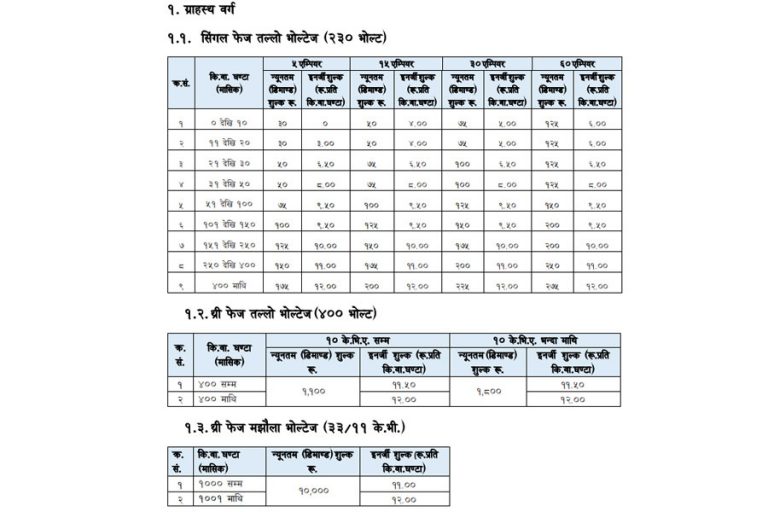 विद्युत नियमन आयोगका अध्यक्ष डिल्लीबहादुर सिंहका अनुसार ५ एम्पियरको सिंगलफेज मिटर जोड्ने ग्राहकले ११ देखि २० युनिटसम्म खपत गर्दा डिमान्ड शुल्क ३० रुपैयाँ तिर्नुपर्ने छ । प्रतियुनिट शुल्क ३ रुपैयाँ कायम भएको छ ।