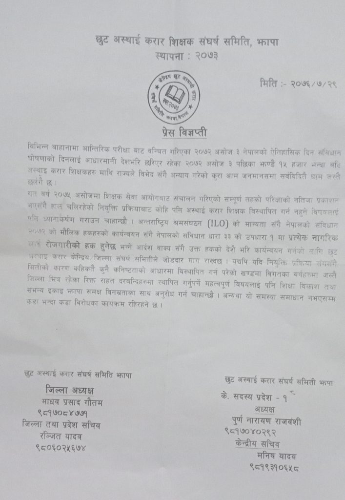 शुक्रबार एक प्रेस बिज्ञप्ती जारि गर्दै छुट अस्थायी शिक्षकहरुले नसयुक्ती प्रकृया सँगसँगै मितीका कारण कहि कतै कुनै कनिष्ठताका आधारमा बिस्थापित गर्न परेको खण्डमा बिगतका बर्षहरुमा जस्तै जिल्ला भित्र रहेका रिक्त राहत दरवन्दी हरुमा स्थापित गर्नु पर्ने महत्वपुर्ण बिषयलाइ पनि शिक्षा बिकास तथा सामान्य इकाइ झापा समक्ष बिनम्रताका साथ अनुरोध गरेका छन् ।