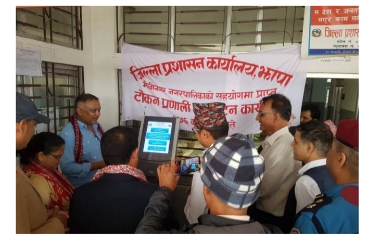 मेचीनगर नगरपालिका कार्यालयको तीन लाख आर्थिक सहयोगमा भद्रपुरस्थित प्रशासन कार्यालयको मूल ढोकामा जडान गरिएको टोकन प्रणाली मेशिनको बिहीबार एक कार्यक्रमका बीच उद्घाटन गरिएको छ । मेचीनगर नगर प्रमुख विमल आचार्य, उपप्रमुख मीना उप्रेती र प्रमुख जिल्ला अधिकारी उदयबहादुर राना मगरले मेशिनको स्विच थिचेर टोकन प्रणालीको उद्घाटन गरेका हुन् ।