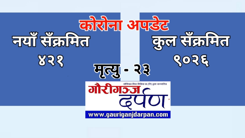 असार ७ गौरीगञ्ज । आज झापाका ६ जना सहित देशभर थप ४२१ जनामा कोरोना सँक्रमण पुष्टि भएको छ । यो संगै कुल संक्रमितको संख्या ९ हजार २६ पुगेको छ ।