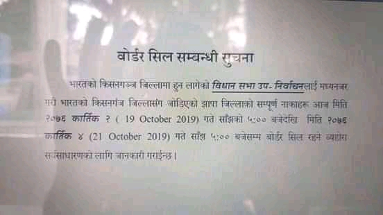 भारतको किशनगन्ज जिल्लामा हुन लागेको बिधानसभा उपनिर्वाचनका लागि बोर्डर शिल गरिने जिल्ला प्रहरी कार्यलय झापाका प्रवक्ता महेन्द्र श्रेष्ठले जानकारी दिए ।