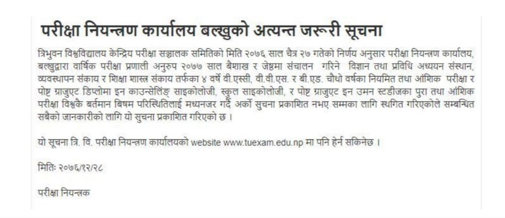 कोरोना भाइरस(कोभिड–१९) को संक्रमणको जोखिमलाई मध्यनजर गर्दै अर्को सूचना प्रकाशित नभएसम्मका लागि परीक्षा स्थगित गरिएको विश्वविद्यालयद्वारा प्रकाशित सूचनामा उल्लेख छ।