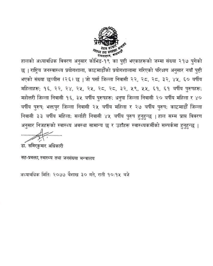 ३१ बैशाख गौरीगञ्ज । नेपालमा मंगलबार थप २६ जनामा कोरोनाभाइरसको संक्रमण पुष्टि भएको छ । योसँगै कूल संक्रमितको संख्या २१७ पुगेको छ ।