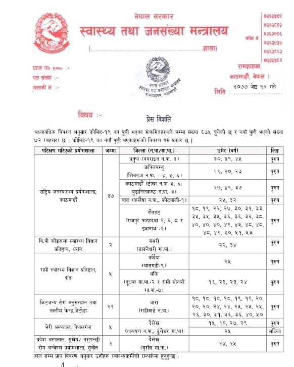 काठमाडौँ । थप ७२ जनामा कोरोनाभाइरसको संक्रमण पुष्टि भएको छ । योसँगै नेपालमा कूल संक्रमितको संख्या ६७५ पुगेको छ । नयाँ संक्रमितहरु धनुषा, कपिलवस्तु, काठमाडौँ, बारा, रौतहट, सप्तरी, बर्दिया, बाँके र दैलेखका रहेका छन् ।