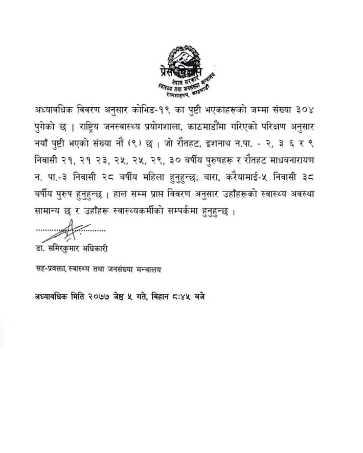 ५ जेट गौरीगञ्ज । आज नेपालमा फेरि ९ जना कोरोना संक्रमित थपिएका छन् । रौतहट र बाराका ९ जनामा कोरोना पुष्टि भएको हो। यो सँगै सँक्रमितको सँख्या ३ सय ४ पुगेको छ भने २ को मृत्यु र ३६ जना सँक्रमण मुक्त भएका छन् ।