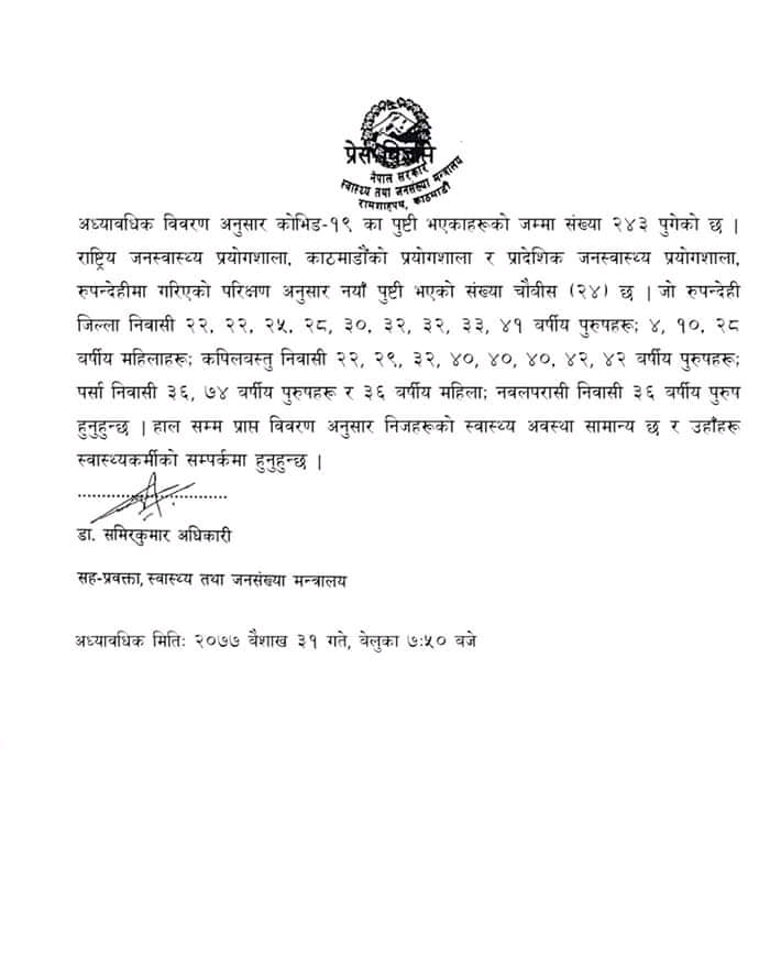 स्वास्थ्य मन्त्रालयले दिएको जानकारी अनुसार रुपन्देहीमा १०, कपिलवस्तुमा ८, पर्सामा २ र नवलपरासीमा १ जना कोरोना संक्रमित फेला परेको मन्त्रालयका सहप्रवक्ता डा. समिरकुमार अधिकारीले जानकारी दिएका छन् ।मन्त्रालयले दिउसो २ जनामा सँक्रमण पुष्टी भएको जनाएको थियो । यो सँगै सँक्रमितको सँख्या २४३ पुगेको छ ।