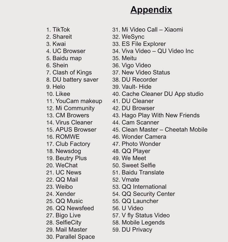 भारत सरकारले चीन द्वाराउत्पादित टिकटक लगायत ५९ वटा मोबाइल एप्लिकेशनहरुमाथि प्रतिबन्ध लगाएको छ । टिकटक, युसी ब्राउजर, सेयरइट, लाइक, हेलो लगायत का लोकप्रीय एप्लिकेसनहरु प्रतिबन्धमा परेकाछन् ।
