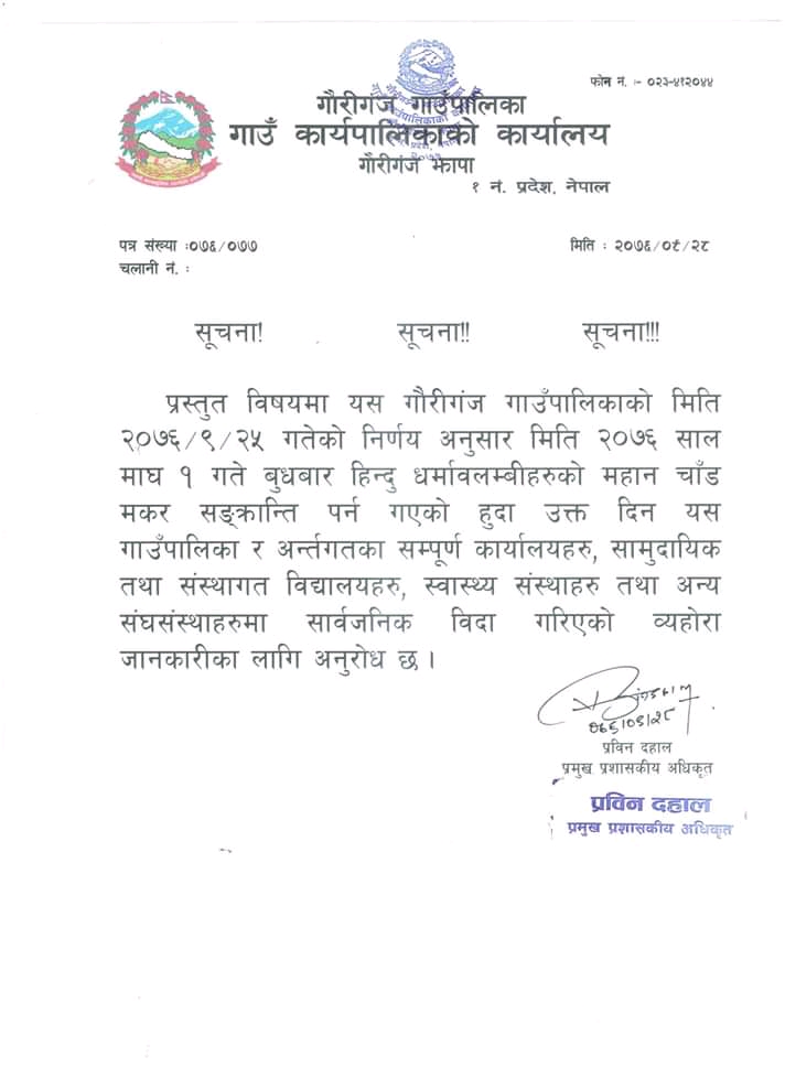प्रमुख प्रसाशकिय अधिकृत प्रबिण दाहालद्वारा हस्ताक्षरित सुचनामा लेखिएको छ – गौरीगञ्ज गाउँपालिका को मिति २०७६ पुस २५ गतेको निर्णय अनुसार २०७६ माघ १ गते बुधबार हिन्दु धर्मालम्बिहरुको महान चाँड मकर सँक्रान्ति पर्न गएको हुदा उक्त दिन यस गाउँपालिका र अन्तर्गतका सँपुर्ण कार्यालयहरु , सँस्थागत र सामुदायिक बिद्यालयहरु स्वास्थ्य सँस्थाहरु तथा अन्य सँघ सँस्थाहरुमा सार्बजनिक बिदा गरिएको कुरा जानकारीका लागि अनुरोध छ ।