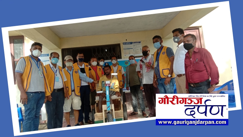 २ असार गौरीगञ्ज । लायन्स क्लब अफ दमक गोल्ड ले गौरीगञ्ज गाउँपालिका भित्रका एक अपाँगता भएका ब्यक्तिलाइ ह्वील चियर सहयोग गरेकाछन् । गौरीगञ्ज ६ खजुरगाछी का ३६ वर्षिय रञ्जित थापालाइ सो सहयोग गरिएको हो । नेपाल अपँगता सहयोग समितिको समन्बयमा सँस्थाका प्रेसिडेन्ट काशी खाति सचिब नबिन ताम्राकार प्रथम उपाध्यक्ष रिङ कुमार आचार्य लगायत सँस्थाका पदाधिकारीहरु र गौरीगञ्ज गाउँपालिकामा उपाध्यक्ष दिपेन्द्र थापा लगायतको उपस्थितिमा ह्वील चियर हस्तान्तरण गरिएको थियो ।