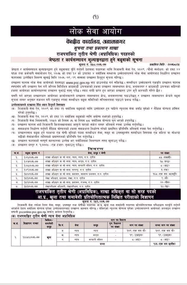 आयोगले राजपत्रांकित तृतीय श्रेणी (अप्राविधिक) पदका विभिन्न सेवा समूह तथा उपसमूह अन्तर्गतका पदमा खुलातर्फ ७६८ र बढुवातर्फ ३२८ गरी १ हजार ९६ शाखा अधिकृतका लागि विज्ञापन आह्वान गरेको हो ।