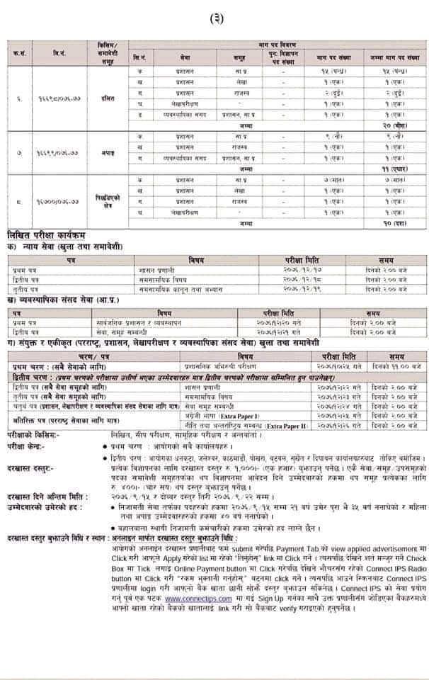 सबैभन्दा बढी सामान्य प्रशासन सेवातर्फ ५६० पदका लागि विज्ञापन आह्वान गरिएको छ । त्यस्तै, लेखातर्फ ३०, राजस्व सेवातर्फ ६९, लेखा परीक्षणतर्फ ४२, परराष्ट्र सेवामा ४, न्याय सेवातर्फ ३६३ र व्यवस्थापिका संसद्तर्फ २८ पदमा विज्ञापन खुला गरिएको छ ।