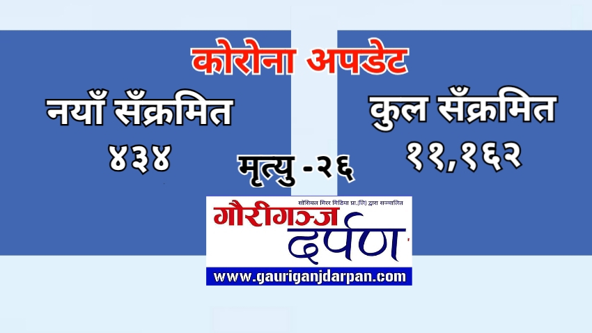 ११ असार, गौरीगञ्ज । आज नेपालमा थप ४ सय ३४ जनामा कोरोना संक्रमण भएको छ । स्वास्थ्य तथा जनसंख्या मन्त्रालयका अनुसार अहिलेसम्म संक्रमितको संख्या ११ हजार १ सय ६२ पुगेको छ ।