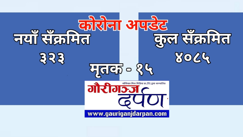 २७ जेठ, गौरीगञ्ज । आज थप ३२३ जनामा कोरोना भाइरस (कोभिड-१९) संक्रमण पुष्टि भएको छ । यससँगै कुल संक्रमितको संख्या ४ हजार ८५ पुगेको छ ।भने ५८४ जना सँक्रमण मुक्त भएका छन् । सँक्रमणका कारण मृत्यु हुनेको सँख्या १५ पुगेको छ ।