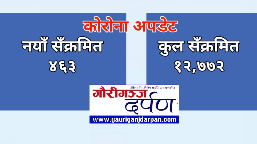१४ असार, काठमाडौं । पछिल्लो २४ घण्टामा ४ सय ६३ नयाँ कोरोना संक्रमित थपिएका छन् । योसंगै नेपालमा कुल कोरोना संक्रमितको संख्या १२ हजार ७ सय ७२ पुगेको छ ।