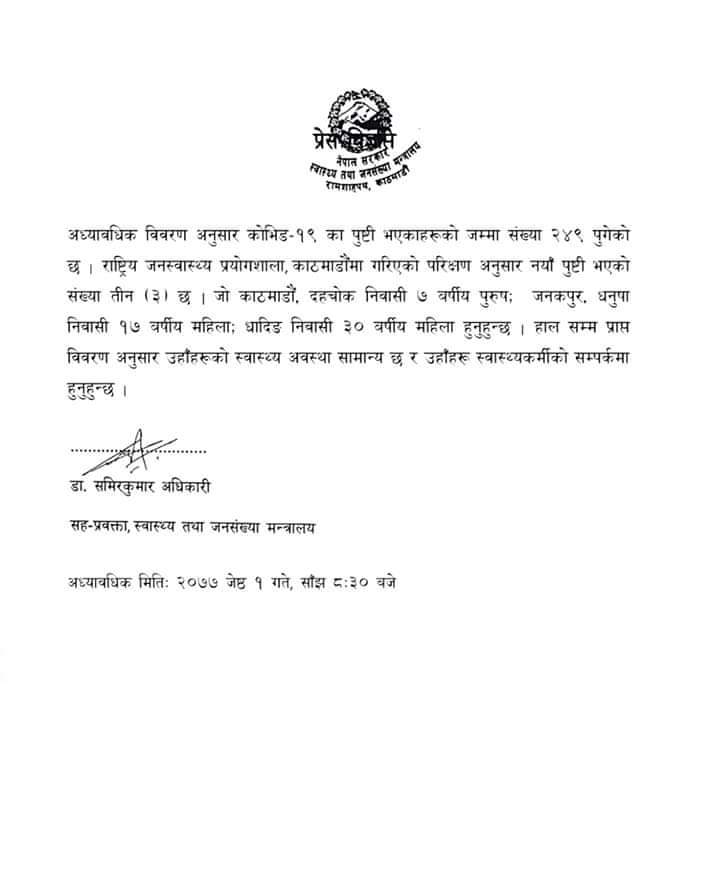 समाचार सँक्रमित सँख्या २४९ पुग्यो प्रकाशित: जेष्ठ १, २०७७ सेयर गर्नुहोस् पढ्न समय: 0 मिनेट सेयर गर्नुहोस् १ जेठ गौरीगञ्ज । भरखरै ३ जना कोरोना सँक्रमित थपिएको छ । यो सँगै सँक्रमितको सँख्या २४९ पुगेको छ । प्रतिक्रिया लेख्नुहोस् झापा र मोरँगमा बढारिए पुराना दल भ्रष्टाचार मुद्दामा इप्रका गौरीगञ्जका तत्कालिन प्रमुख आपागाइ सहितले पाए सफाइ ६ महिनामा ८७ दिन मात्र हाजिर । सुचना माग्दा कामकाज ठप्प पार्ने चेतावनी । सीमा वर्ती चेरोरा जँगलमा बिबाद । दुइ जना घाइते । प्याबसन गौरीगञ्जको साँस्कृतिक कार्यक्रममा स्नोह्वाइटको ह्याट्रिक यो समाचार सेयर गर्नुहोस् फेसबुक Whatsapp Whatsapp लिङ्क कपी गर्नुहोस् छाप्नुहोस् अघिल्लो लेख थप ७ मा सँक्रमण पुष्टी : सँक्रमितको सँख्या २५० पुग्यो अर्को लेख सँक्रमित सँख्या २ सय ५८ पुग्यो टिप्पणी छोड्नुहोस् Leave a Reply Cancel replyYour email address will not be published. Required fields are marked *Comment * Name Email Website Δ जनमत सर्वेक्षणमाफ गर्नुहोस्, हाल कुनै मतदान उपलब्ध छैन। - Advertisement - ताजा समाचार वडाध्यक्ष र वडासदस्य बीचको बिबाद : के थियो घटना ? गौरीगञ्ज चैत्र १०, २०८२ सरसफाइमा ध्यान नदिएपछी स्थानियले बन्द गराए कन्काइ ह्याचरी झापा चैत्र ६, २०८२ गौरीगञ्ज दर्पणले खोजिनिति गरेपछी चँदाराले तिरे बेरुजु रकम गौरीगञ्ज फाल्गुन १२, २०८२ महाभारा स्वास्थ्य चौकीको ल्याब बन्द गरेकोमा स्थानियहरुको आपत्ती गौरीगञ्ज फाल्गुन १२, २०८२