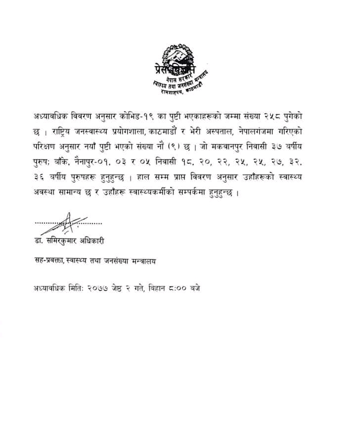 स्वास्थ्य तथा जनसंख्या मन्त्रालयले शुक्रबार बिहान जारी गरेको प्रेस विज्ञप्तिका अनुसार राष्ट्रिय जनस्वास्थ्य प्रयोगशाला काठमाडौं र भेरी अस्पताल नेपालगञ्जमा भएको परीक्षणमा थप ९ जनामा संक्रमण भेटिएको हो ।