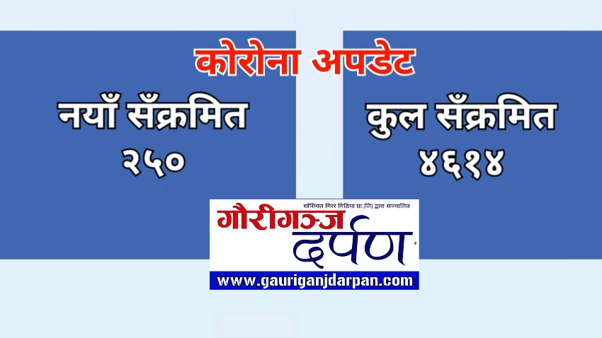 २९ जेठ, गौरीगञ्ज । आज थप २५० जनामा कोरोना भाइरस (कोभिड-१९) संक्रमण पुष्टि भएको छ । यससँगै कुल संक्रमितको संख्या ४ हजार ६ सय १४ पुगेको छ ।भने ८६१ जना सँक्रमण मुक्त भएका छन् ।