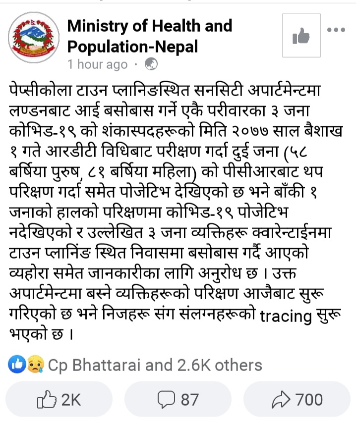 उनीहरु मध्ये दुई जना (छोरा र आमा) को रिपोर्ट आएको छ र, कोरोना संक्रमण पुष्टि भएको छ । बाँकी एक (बुहारी) को भने नेगेटिभ रिपोर्ट आएको स्वास्थ्य तथा जनसंख्या मन्त्रालयले जनाएको छ ।