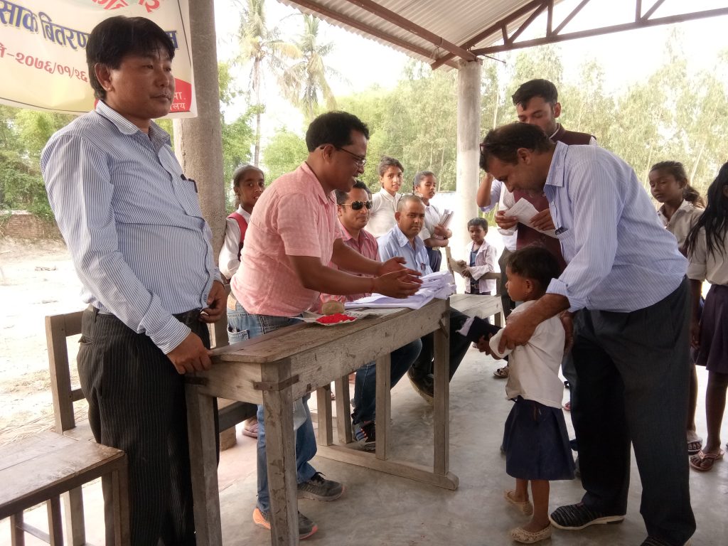 पोसाक बितरणमा वडा सचिक सन्तोष मिश्र र सहारा नेपालका उमेश भारती लगायतका हरु सहभागि थिए ।