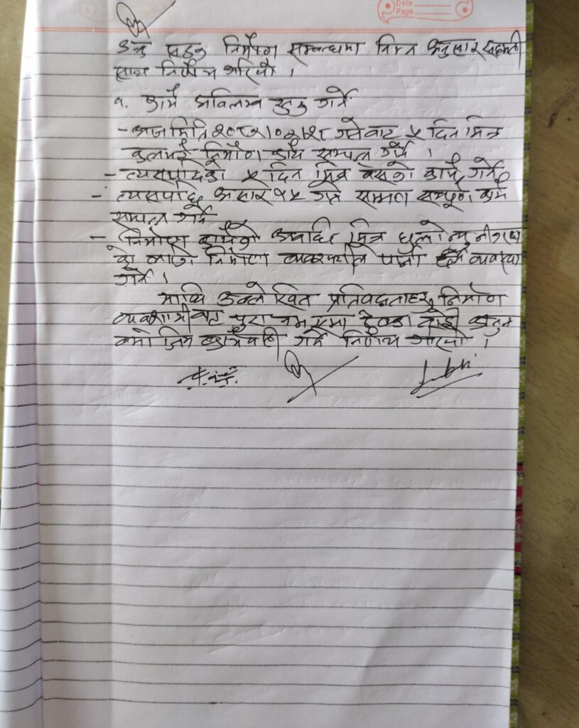 छलफलले गरेको लिखित सहमतीमा आज जेठ २८ गते देखि नै काम शुरु गर्ने र कल्भर्टको काम ५ दिन भित्र सक्ने साथै असा १५ गते भित्र सडक कालोपत्रे गर्ने काम समेत सम्पन्न गर्ने सहमती भएको छ । त्यसै गरि सडकमा धुलो नउड्न सडक नबनुञ्जेल दैनिक पानी हाल्ने समेत सहमती गरेको छ ।