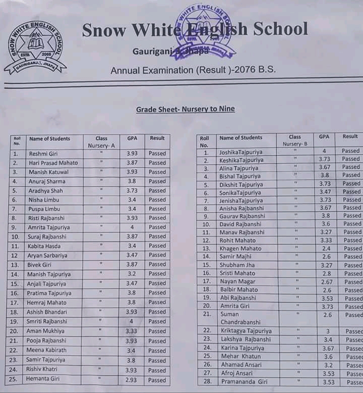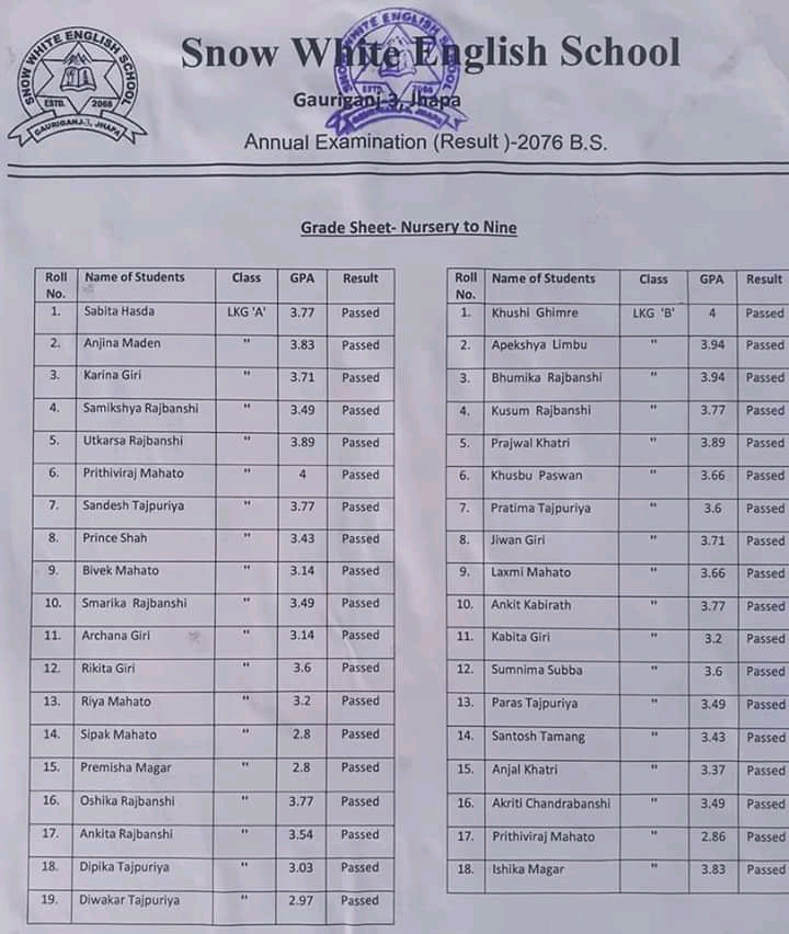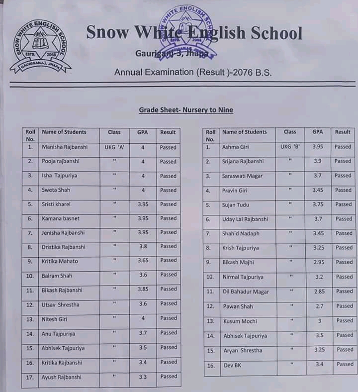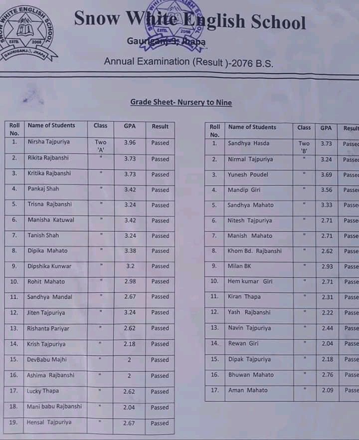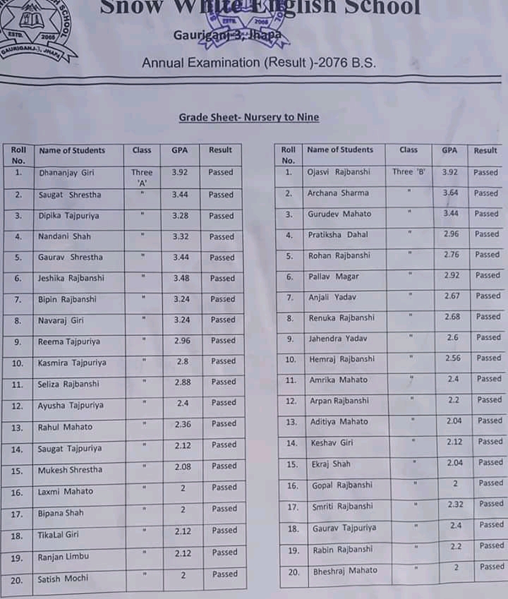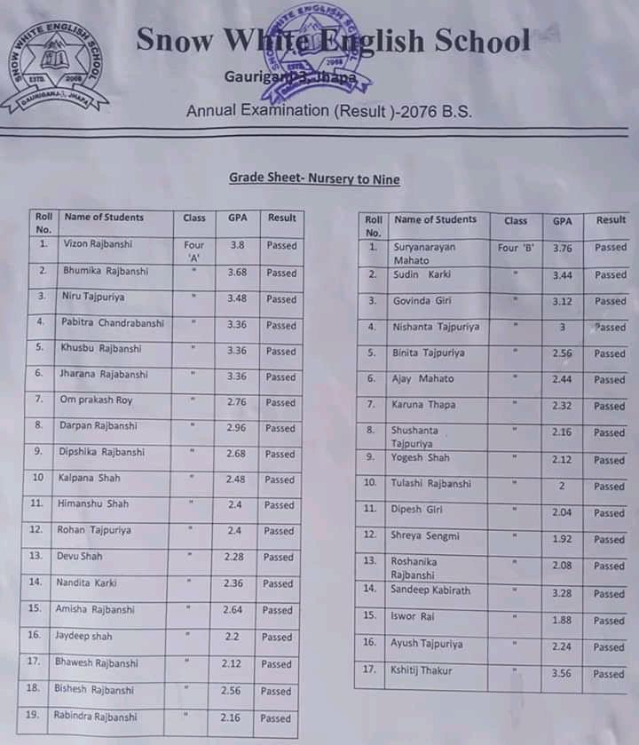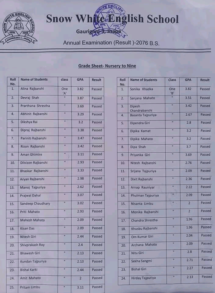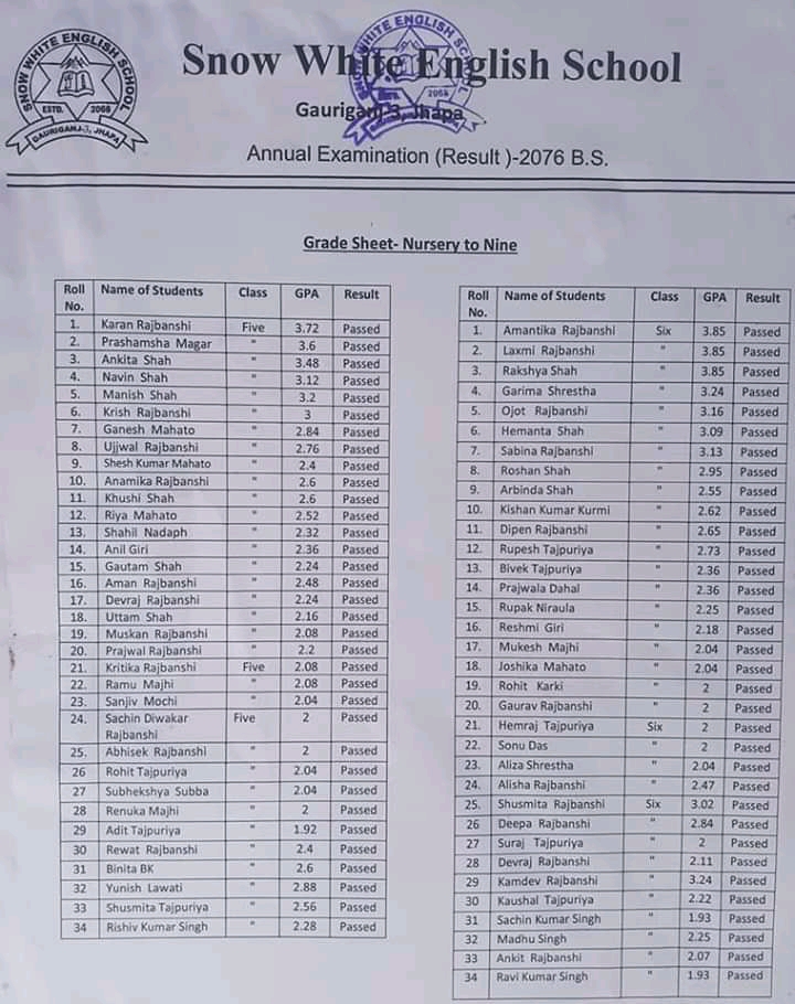 गौरीगञ्ज स्नो ह्वाइट ईङ्ग्लिस स्कुल गौरीगञ्जको बार्षिक परीक्षा नतिजा हेर्नुहोस प्रकाशित: बैशाख ३०, २०७७ सेयर गर्नुहोस् पढ्न समय: 0 मिनेट सेयर गर्नुहोस् स्नो ह्वाइट ईङ्ग्लिस स्कुल गौरीगञ्जको बार्षिक परीक्षा नतिजा हेर्नुहोस प्रतिक्रिया लेख्नुहोस् वडाध्यक्ष र वडासदस्य बीचको बिबाद : के थियो घटना ? गौरीगञ्ज दर्पणले खोजिनिति गरेपछी चँदाराले तिरे बेरुजु रकम महाभारा स्वास्थ्य चौकीको ल्याब बन्द गरेकोमा स्थानियहरुको आपत्ती गौरीगञ्ज दर्पणले खोजिनिति गरेपछी चँदाराले तिरे बेरुजु रमक कार्यालयको कामकाज नै ठप्प हुने गरि अधिकाँश कर्मचारी वर्ल्डकप र तालिम तिर यो समाचार सेयर गर्नुहोस् फेसबुक Whatsapp Whatsapp लिङ्क कपी गर्नुहोस् छाप्नुहोस् अघिल्लो लेख नेपालमा पहिलो पल्ट २ पत्रकार र एक स्टाफ नर्समा देखियो कोरोना सँक्रमण अर्को लेख थप २६ मा सँक्रमण पुष्टी : सँक्रमितको सँख्या २१७ पुग्यो टिप्पणी छोड्नुहोस् Leave a Reply Cancel replyYour email address will not be published. Required fields are marked *Comment * Name Email Website Δ जनमत सर्वेक्षणमाफ गर्नुहोस्, हाल कुनै मतदान उपलब्ध छैन। - Advertisement - ताजा समाचार सरसफाइमा ध्यान नदिएपछी स्थानियले बन्द गराए कन्काइ ह्याचरी झापा चैत्र ६, २०८२ झापा र मोरँगमा बढारिए पुराना दल समाचार फाल्गुन २४, २०८२ भ्रष्टाचार मुद्दामा इप्रका गौरीगञ्जका तत्कालिन प्रमुख आपागाइ सहितले पाए सफाइ समाचार फाल्गुन १४, २०८२ झापा जिल्ला स्तरीय राष्ट्रपति रनिङ शिल्ड प्रतियोगिताको उपाधी अर्जुनधारा नगरपालिका लाइ झापा फाल्गुन ६, २०८२