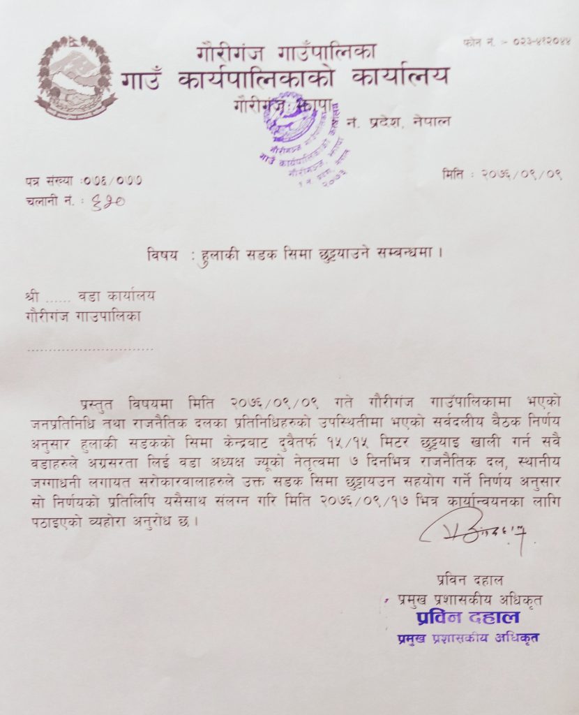 यस अघि गौरीगञ्ज गाउँपालिका र नापी शाखा दमकले चलन चल्तीको सडकलाइ आधार मानी नक् बिना नै सडकको क्षेत्र छुट्याउन थालेका थिए भने नक्सा नभिडाइ सडक को केन्द्र निर्धारण गरेकोमा स्थानीयबासीहरुले बिरोध गरेका थिए ।