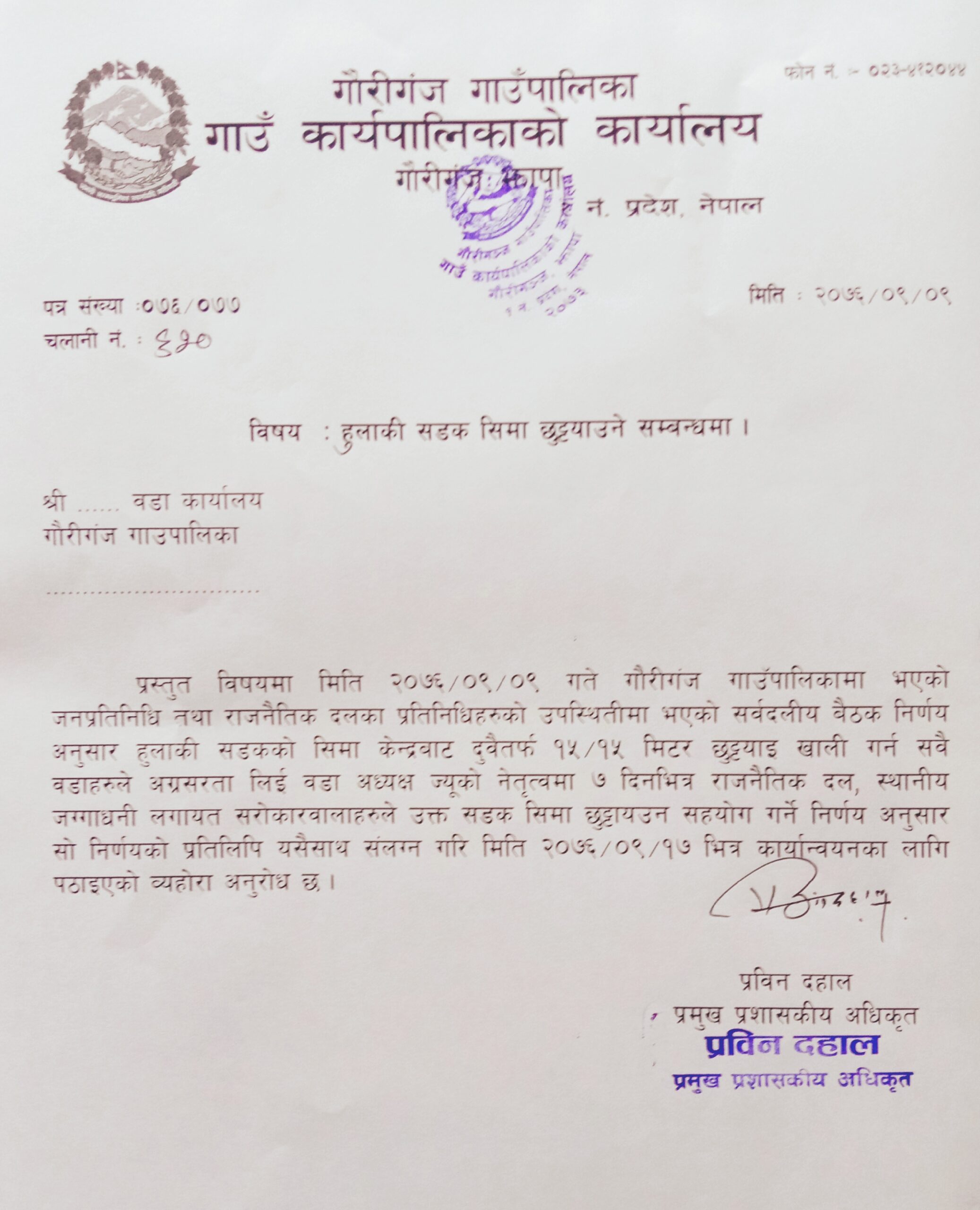 ८ पुस झापा । गौरीगञ्ज गाउँपालिका क्षेत्रमा हुलाकी सडक बिस्तारका लागि सडक नाप जाँचमा भएको बिबाद समाधानार्थ बुधबार बिहान गौरीगञ्ज गाउँपालिकामा सर्वपक्षिय बैठक बसेको छ । बिभिन्न राजनैतिक दलका स्थानीय प्रतिनिधि तथा निर्वाचित जनप्रतिनिधिहरुको उपस्थितीमा भएको छलफलमा ७ दिन भित्र वडाध्यक्षहरुको नेतृत्वमा राजनैतिक दल जग्गाधनी र सरोकारवालाहरुले उक्त सडक सीमा छुट्याउन सहयोग गर्ने निर्णय गरेकोछ । छलफल पछी गौरीगञ्ज गाउँपालिकाले सबै वडा कार्यालयहरुलाइ पत्र काट्दै पुस १७ गते सम्ममा सो निर्णय कार्यन्वयन गराउन भनेको छ ।