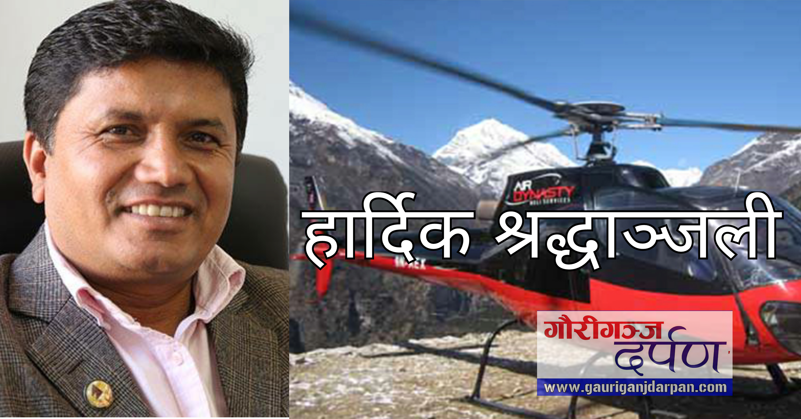 बुधबार दिउँसो ताप्लेजुङमा भएको एयर डाइनेष्टी हेलिकप्टरमा परी संस्कृति, पर्यटन तथा नागरिक उड्ड्यन मन्त्री रवीन्द्र अधिकारीसहित ७ जनाको मृत्यु भएको छ । काठमाडौंबाट बिहान साढे ८ बजे तेह्रथुमका लागि कल साइन अल्फा माइक इन्डिया (एएमआई) भएको हेलिकप्टरमा सवार सबैको मृत्यु भएको प्रहरीले जनाएको छ । ईकान्तिपुरमा खबर छ |