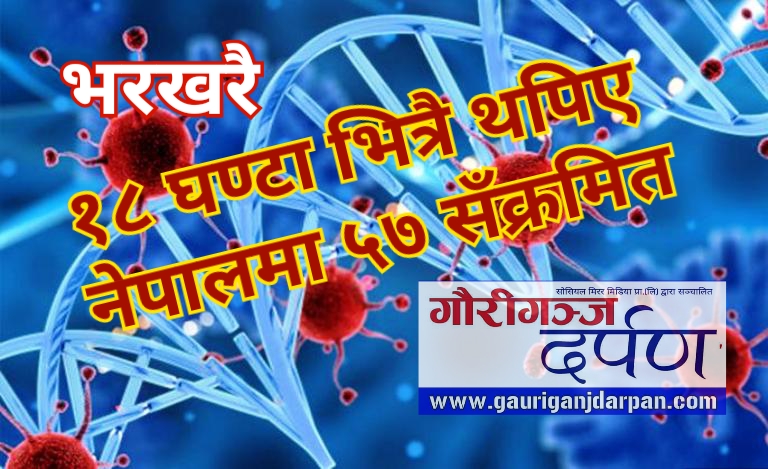 ३० बैशाख गौरीगञ्ज । मँगलबार एकै दिन ५७ जनामा कोरोना भाइरस सँक्रमणको पुष्टी भएको छ । १८ घण्टा भित्रै नेपालमा यति भारी सँख्यामा सँक्रमित थपिएको हो । स्वास्थ्य मन्त्रालयले मँगलबार १ बजेर १० मिनेटमा एक बिज्ञप्ति जारी गर्दै सो सँख्यामा सँक्रमण पुष्टी भएको जनाएको हो । गए राति मन्त्रालयले ७ बजेर २० मिनेट जादा सम्म सँक्रमितको सँख्या १३४ रहेको पुष्टी गरेको जनाएको थियो । १८ घन्टाको दौरान थपिएका सँक्रमित हरु कपिलबस्तु जिल्लाका बिभिन्न ठाउँका ८ जना रुपन्देहीका ९ जना पर्साका ३९ जना र बाराका १ जना रहेको जनाएकोछ । यो सँगै नेपालमा सँक्रमितको सँख्या १ सय ९१ पुगेको छ ।